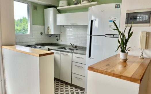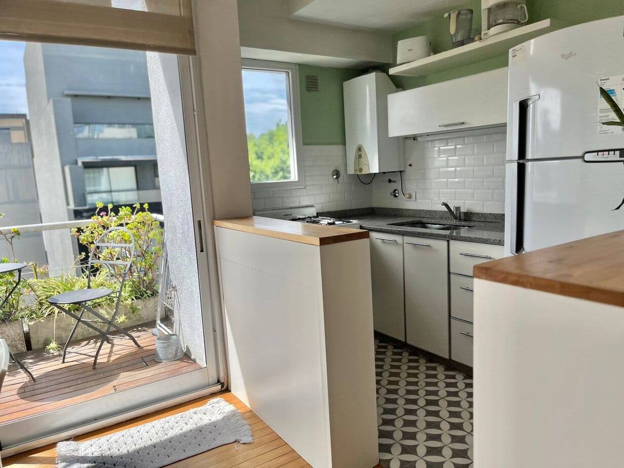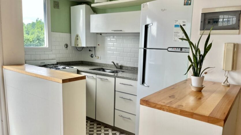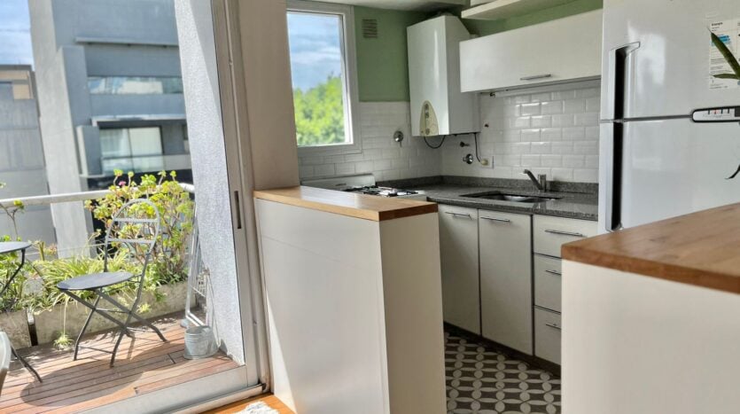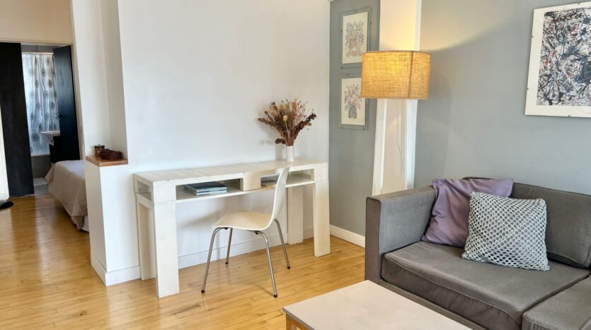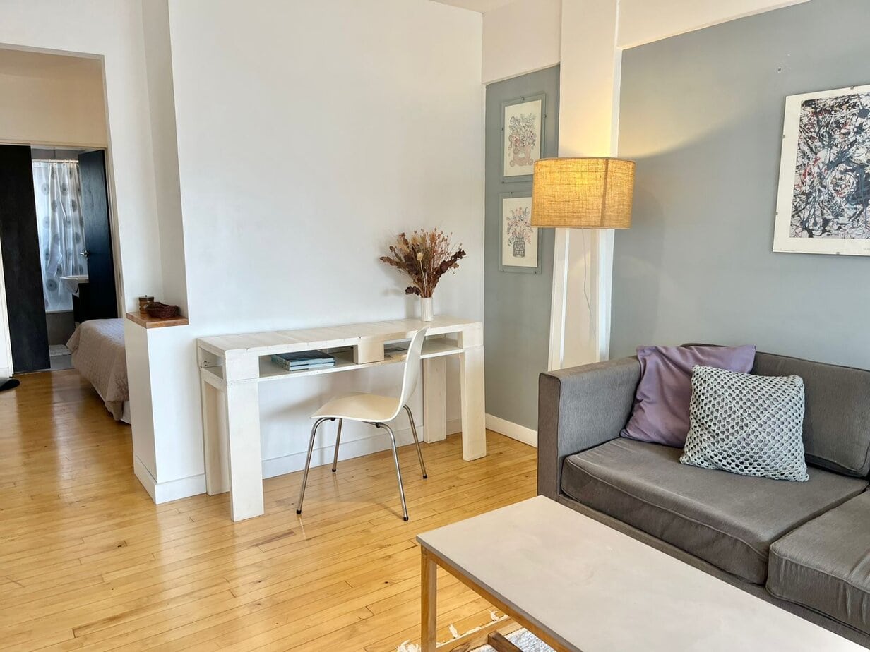 El departamento tiene un dormitorio en la suite y una sala de estar separada, así como el área de cocina.