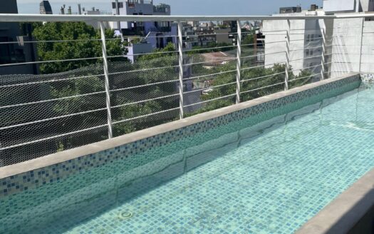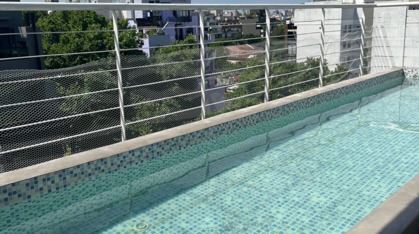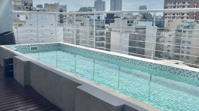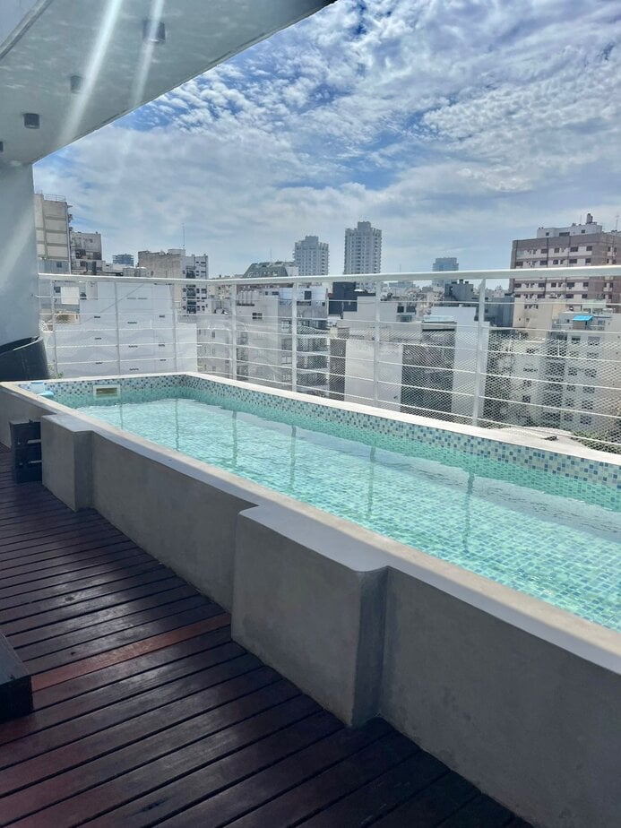 El edificio tiene una gran piscina para uso en verano con reposeras que rodean la piscina.