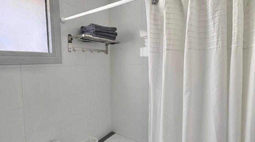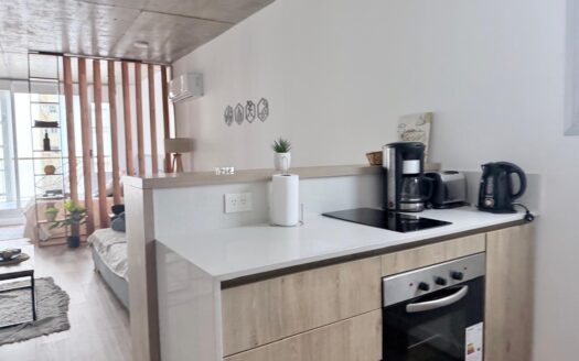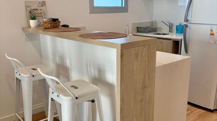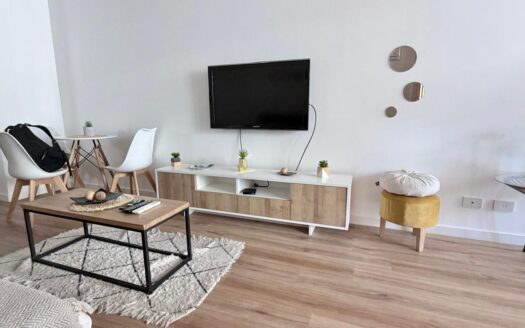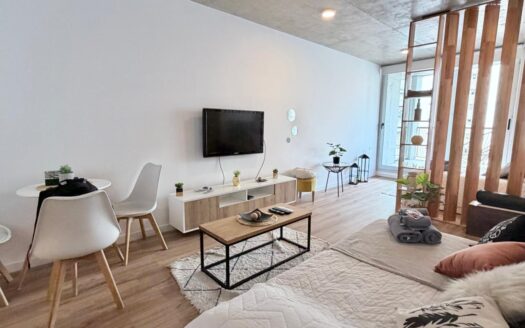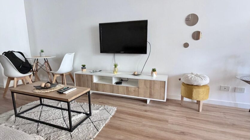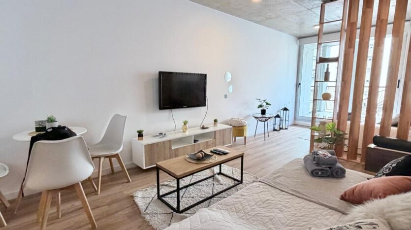 Un luminoso living con un cómodo sofá y un gran televisor. Una cocina abierta totalmente equipada con electrodomésticos modernos. Un elegante biombo separa sutilmente la zona de dormitorio del salón.