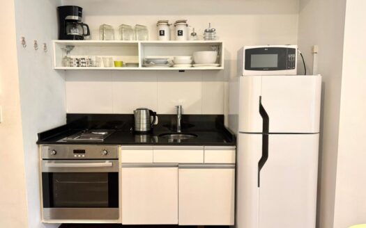 Cocina con una heladera grande, microondas, hornito eléctrico, sandwichera, cocina eléctrica con 2 hornallas.