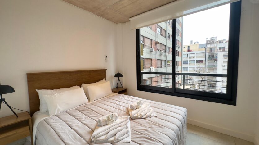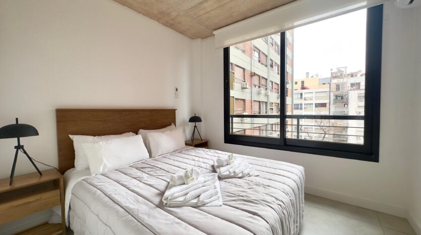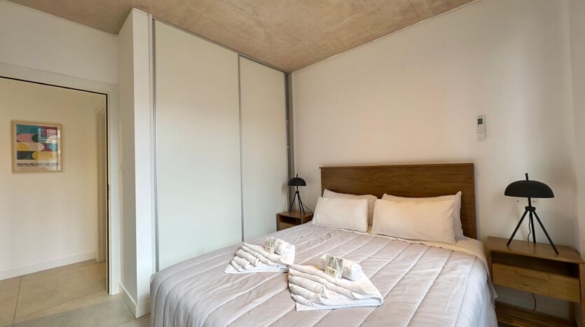 The bedroom offers a comfortable queen-size bed, ample storage space, and a modern and welcoming atmosphere.