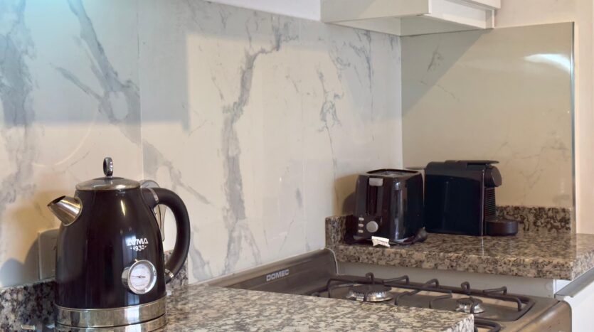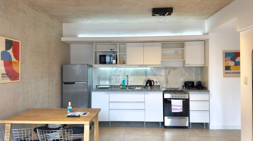 It features a fully equipped open-plan kitchen with a gas stove, full tableware, and top-of-the-line appliances.