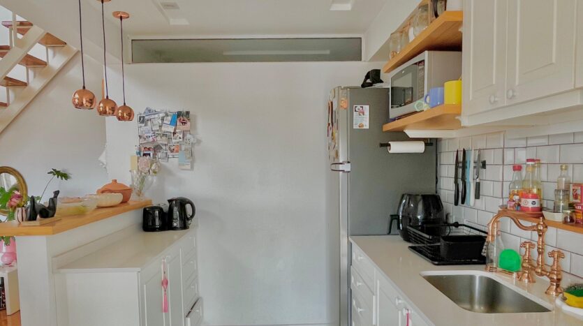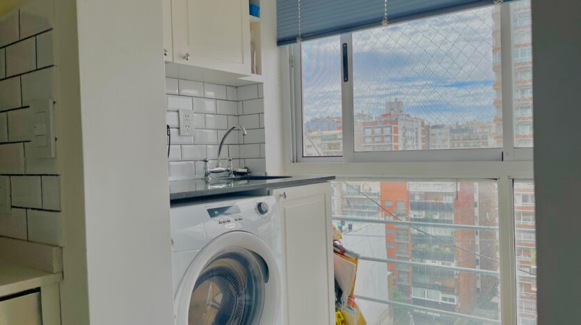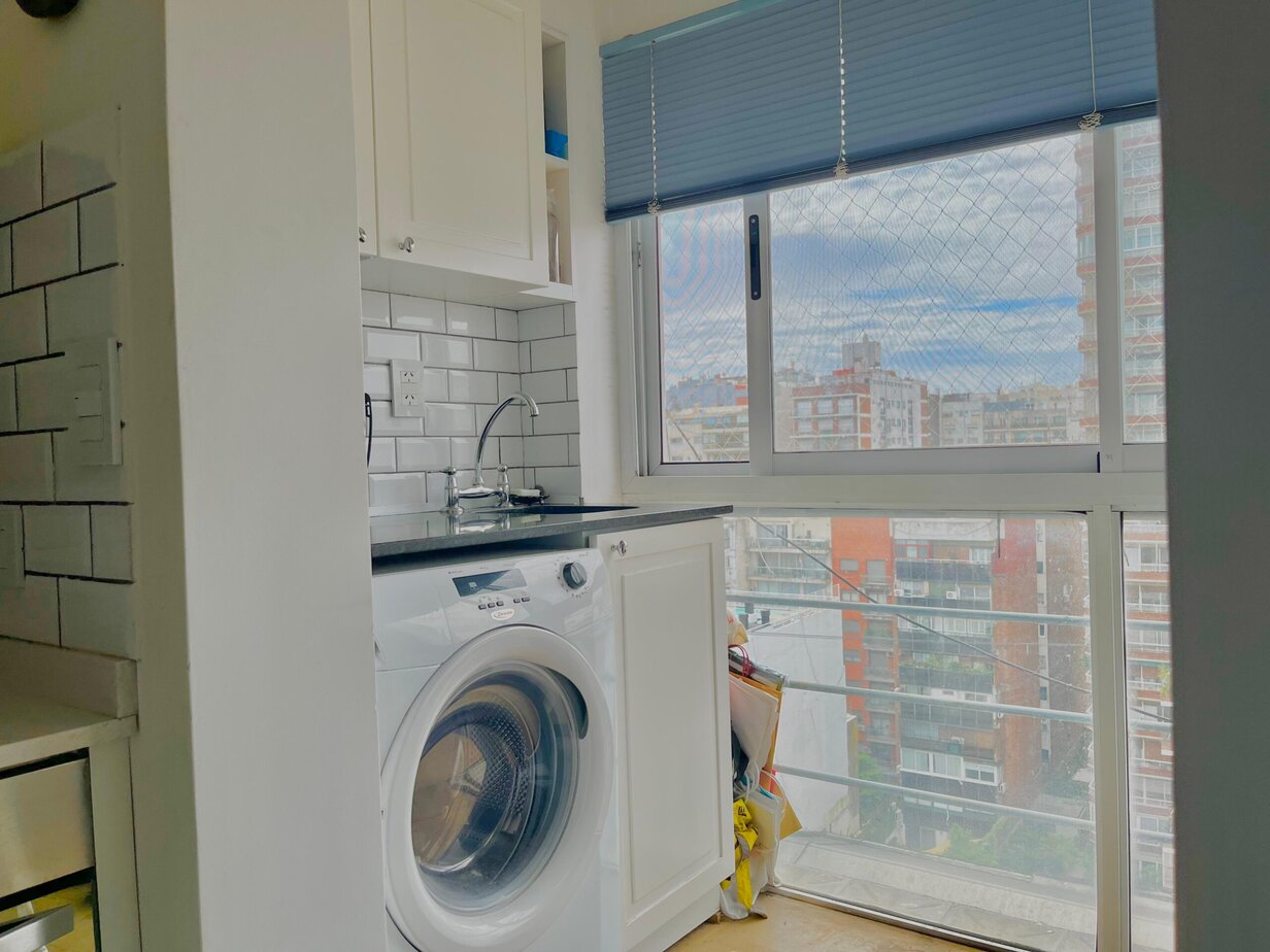 The fully equipped kitchen features ample white cabinetry, a large refrigerator, microwave, and a tiled backsplash, combining style with functionality. The standout feature is the private laundry area with a washing machine and sink, a rarely found convenience in city apartments.