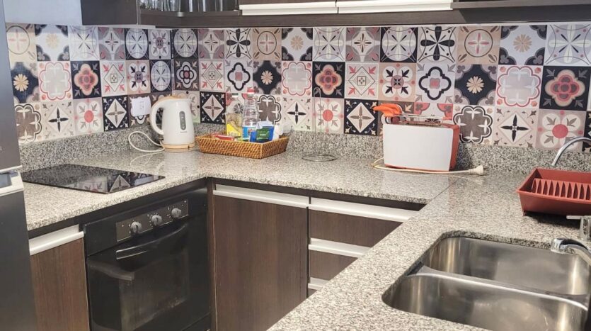 •Fully equipped kitchen with oven, microwave, refrigerator, and kitchenware
