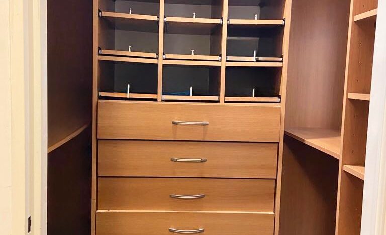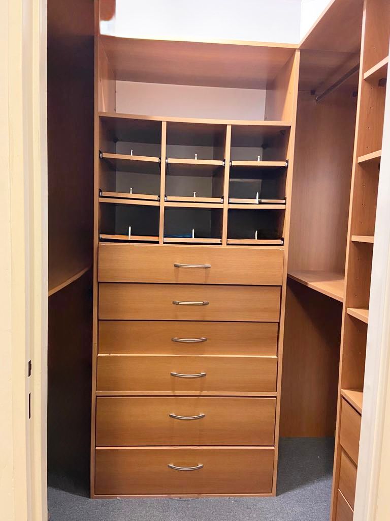 The bedroom offers a comfortable queen-size bed, large closets, and air conditioning (hot/cold).