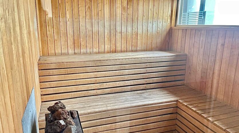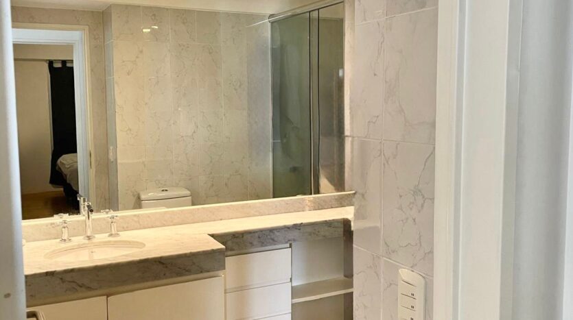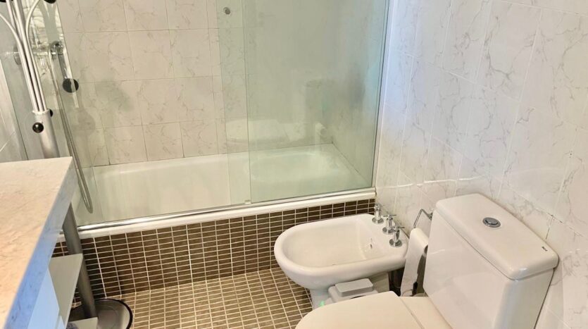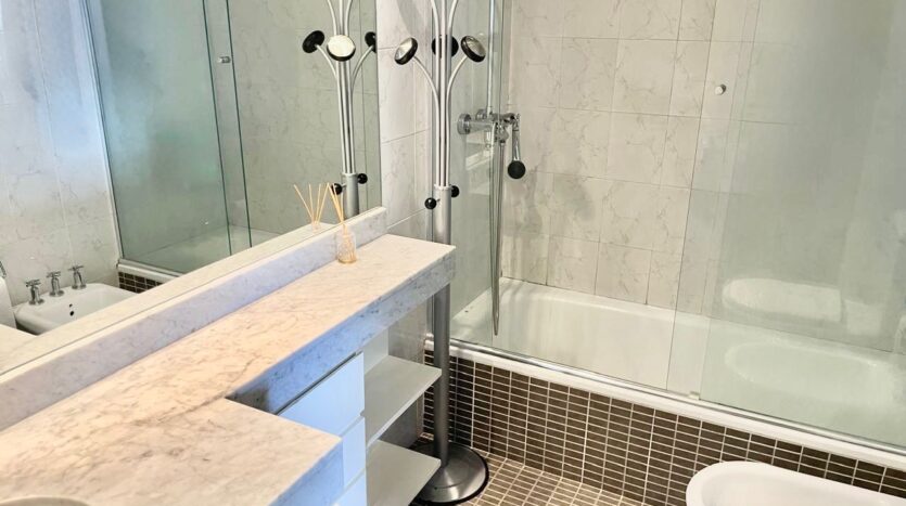 The bathroom is modern, with a bathtub, glass enclosure, and marble finishes.