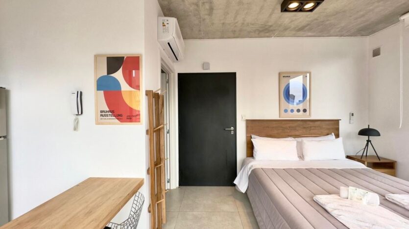 This modern studio features a comfortable queen-size bed, a sleek private bathroom with glass-enclosed shower, and a fully equipped kitchen with electric stove, microwave, under-counter refrigerator, and all essential cooking utensils. The space includes a wooden dining table for two and a cozy living area with a flat-screen TV and air conditioning.