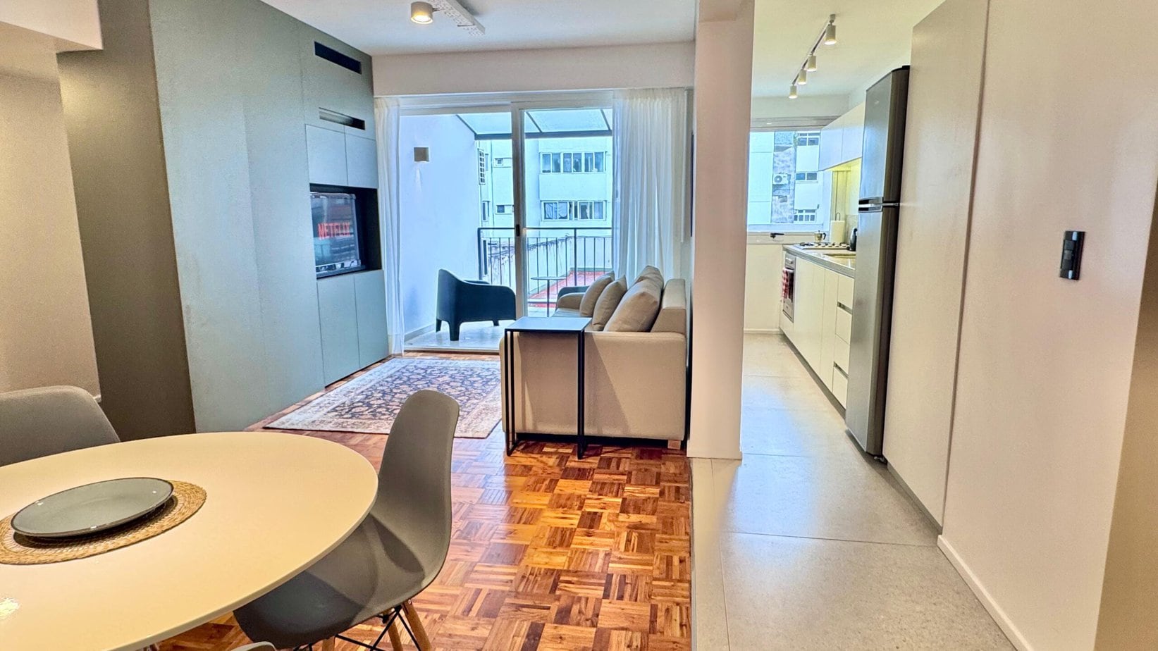 Recently renovated and fully furnished, this 48m² apartment features a spacious terrace-style balcony that gets sunlight all day. The separate kitchen is fully equipped, perfect for cooking at home. The living room is spacious and includes a sofa bed with a comfortable mattress and a TV with cable.
